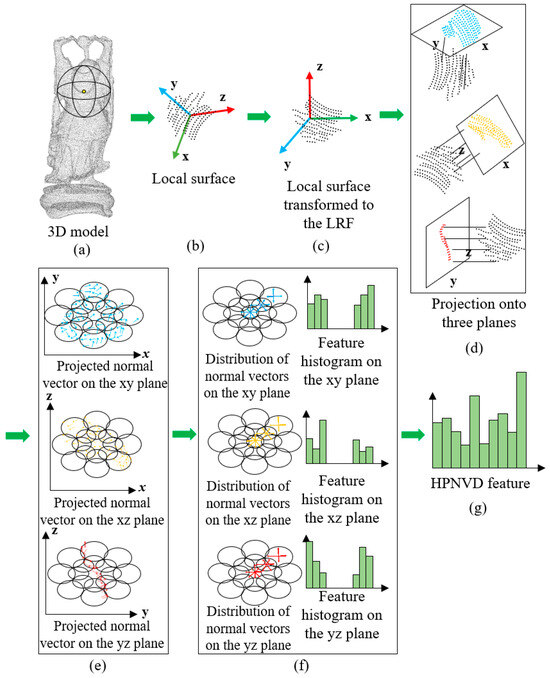 After establishing the LRF for the keypoint’s local surface, the next step is to construct the HPNVD feature descriptor based on this LRF. The mechanism of the HPNVD descriptor is illustrated in Figure 3.