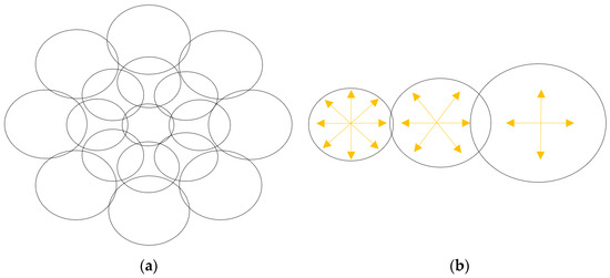 Many effective feature representation methods have been proposed, such as the angle between normal vectors and point density. Another approach is to project the local surface onto 2D planes, and then compute features based on the projected distances of the points, the distribution of the point normals, and the contour features of the projections. For example, the HGND [18] descriptor projects the neighboring points and their normal vectors onto three planes (xy, yz, and xz), and then generates a feature histogram based on the distribution of the projected normals in the four quadrants of each plane. The HGND descriptor is computationally efficient as it only uses a single triangular mesh to compute the normals. It also has a relatively low feature dimension of 96, compared to hundreds or thousands of dimensions for most other descriptors, leading to faster feature matching. However, dividing each projection plane into only four quadrants while reducing the descriptor’s dimensionality results in a coarse representation of the spatial distribution of the neighborhood points, sacrificing some descriptiveness. To improve the descriptiveness of the feature representation, we propose a new scheme for dividing the projection planes, inspired by the 2D DAISY descriptor [40]. As shown in Figure 4a, we divide the projection plane into concentric circular regions, where the radius of each circle is proportional to the distance from the keypoint. Additionally, the angular division within each circle is also proportional to the distance from the keypoint, with more divisions for the inner circles and fewer for the outer circles, as illustrated in Figure 4b. This process reduces the descriptor’s dimensionality while increasing the influence of the closer points, improving robustness to occlusion and missing data. Furthermore, by introducing overlap between the circular regions, we enhance the robustness of the feature descriptor to noise and achieve a smoother transition between the regions.