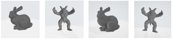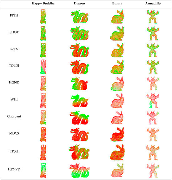 Finally, we evaluate the performance of the descriptors in the point cloud registration application. In the experiment, four models (“Stanford Bunny”, “Armadillo”, “Dragon”, and “Happy Buddha”) from the B3R dataset were used as target point clouds. The models were downsampled by 1/4 and Gaussian noise with a standard deviation of 0.3 pr was added to generate the point clouds to be registered. Then, random sampling was performed on the target and to-be-registered point clouds, selecting 1000 keypoints and computing the descriptors at these points. For each descriptor in the to-be-registered point cloud, the closest corresponding descriptor in the target point cloud was searched, generating a set of matches. The random sample consensus (RANSAC) [50] algorithm was used to find the optimal transformation matrix for coarse registration based on the generated matches. The to-be-registered point cloud was then transformed to the same coordinate system as the target point cloud using the transformation matrix. The root mean square error (RMSE) [51] between corresponding points was calculated as the evaluation metric for registration performance. The RMSE is defined as: