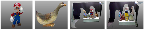 Kinect [8]: The Kinect dataset is captured using the Microsoft Kinect sensor, developed and manufactured by Microsoft Corporation, headquartered in Redmond, WA, USA. The dataset consists of six models and sixteen scenes. The point cloud data includes RGB color information. The scenes in the Kinect dataset contain significant noise, occlusion, and hole, resulting in poor point cloud quality, making it a very challenging dataset for object recognition tasks. Figure 7 shows two example models and two example scenes from the Kinect dataset.