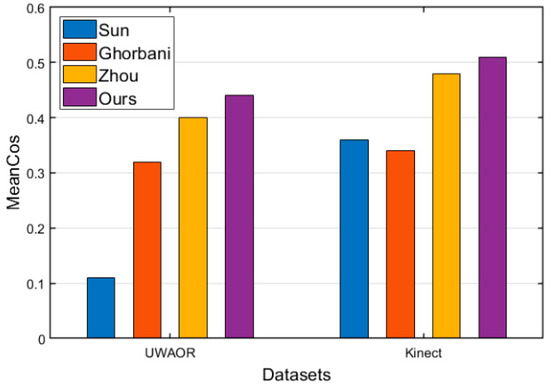 where and represent the LRFs established at corresponding keypoints in the model and scene, respectively. Cos(Z) is the cosine of the angle between the z-axis of the transformed model LRF and the z-axis of the scene LRF. Cos(X) is the cosine of the angle between the x-axes of and after aligning their z-axes. A MeanCos value closer to 1 indicates better repeatability, as it means the angular differences between the corresponding axes of the two LRFs are smaller. Since the y-axis is determined by the cross-product of the z-axis and x-axis, it is not necessary to include it in the MeanCos metric. The LRF performance is evaluated on each dataset. To eliminate the influence of the keypoint detection algorithm on the discriminative power of the feature descriptor, 1000 points are randomly selected in the model point clouds as keypoints, and the corresponding keypoints are found in the scene point clouds based on the ground truth transformation. The LRF is then established at the keypoints in both the model and scene point clouds, and the MeanCos value is calculated for the corresponding keypoint pairs. The average of all the keypoint-pair MeanCos values is taken as the MeanCos value for the model-scene point cloud pair. Finally, the average of all the model-scene MeanCos values is the overall performance evaluation for the dataset.