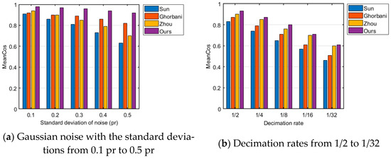 From Figure 12a–c, it can be observed that the HPNVD descriptor proposed in this study achieves the best feature matching performance under different levels of noise interference, followed by the method proposed by Ghorbani and TPSH. As the noise intensity increases, the performance of WHI and HGND drops significantly, and when the noise level is relatively high, the performance of HGND falls below that of WHI. This is because the normal vector information decoded by HGND depends on first-order and second-order surface differential operations, which are very sensitive to noise. Although the proposed method also relies on normal vectors, it has proposed measures to reduce the interference of noise when establishing the LRF, in order to obtain higher repeatability of the LRF. Additionally, it sets overlapping projection planes in the feature encoding stage to resist noise interference. Similarly, TOLDI and RoPS are also sensitive to large Gaussian noise due to the low repeatability of their LRFs under high-intensity Gaussian noise. SHOT and FPFH, which decode normal vector information, perform much worse than the other descriptors due to their sensitivity to noise.