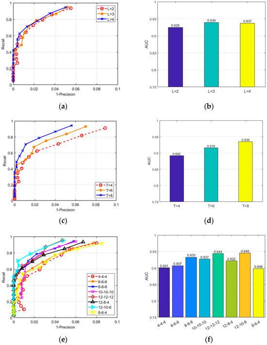 where is the number of correct matches, and is the number of incorrect matches, and is the total number of matches, and is the number of actual corresponding point pairs. The better the feature matching performance of the descriptor, the closer the RPC is to the top-left corner. Furthermore, the area under the RPC (AUC) can be used to represent the overall performance of the RPC. It is calculated as the sum of the area of the polygon formed by the polyline and the x-axis, and the area of the rectangle to the right of the polyline up to 1-precision = 1. The larger the AUC value, the better the feature matching performance.