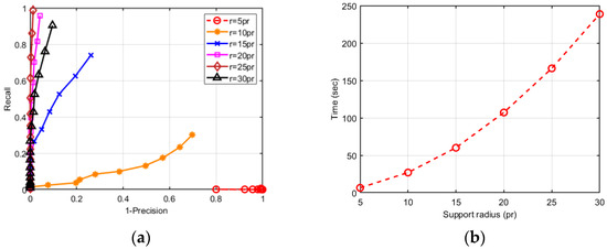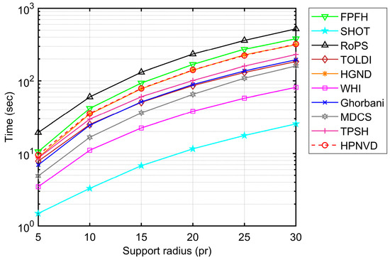 To test the computational efficiency of the descriptors, 1000 points are randomly selected from each model data in the B3R dataset. The local features are then calculated at the selected keypoints under different support radii, and the time cost is measured. Specifically, the support radius r of the descriptors is increased from 5 pr to 30 pr, with an interval of 5 pr, to generate local surfaces of different scales. The experimental results are shown in Figure 15.