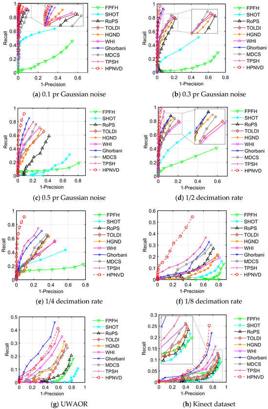 From Figure 12g,h, it can be observed that in the UWAOR, the method proposed by Ghorbani achieves the best performance. This is because, for clutter and occlusion, the features based on normal vectors or projection heights are more significantly affected than the features based on the number of projected points. On the Kinect dataset, the recall rates of all descriptors are relatively low, as the data quality of the Kinect sensor is lower and affected by noise and outliers. Under this challenge, the HPNVD descriptor proposed in this study still achieves the best performance.