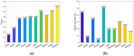 From Table 3, it can be observed that the HPNVD descriptor proposed in this study achieves the overall best (ranking top or second best across all datasets) matching performance. From Figure 13b, we can see that HGND has the highest compactness, followed by FPFH. The high compactness of HGND is mainly due to its medium-level precision and relatively low dimensionality, while FPFH has very low dimensionality at only 33 dimensions. Additionally, TOLDI has the lowest compactness, followed by SHOT. The former is mainly due to its extremely high dimensionality of 1200 dimensions, while the latter has relatively low precision combined with high dimensionality. The proposed HPNVD has relatively poor compactness performance, as its dimensionality is a bit high at 468 dimensions. It is worth noting that using some feature compression techniques, such as principal component analysis (PCA) [41] and linear discriminant analysis (LDA) [47], can significantly improve the compactness of HPNVD. To enhance the compactness of HPNVD, we utilize PCA for compression. The PCA technique for compressing local feature descriptors is presented in [48,49]. In this approach, compression is achieved by projecting the original feature vectors into the PCA subspace. Specifically, a set of training features is first constructed from the dataset. These training features are then used to build the covariance matrix, which is employed to generate the PCA subspace through its eigenvectors. Finally, the original features are projected into the PCA subspace to create the compressed features. For more detailed information, readers are referred to [48,49].