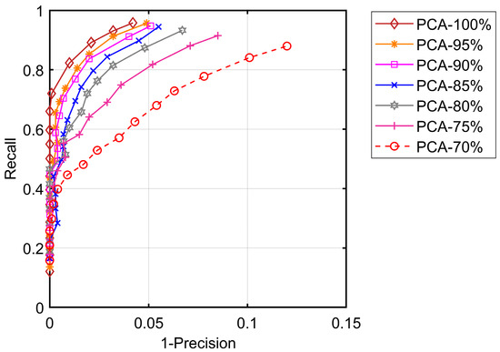We tested the performance of the HPNVD descriptors at different compression levels on the B3R dataset. The fidelity percentages are set to 100%, 95%, 90%, 85%, 80%, 75%, and 70%. The experimental results are illustrated in Figure 14. It is evident that the feature matching performance of HPNVD deteriorates gradually with decreasing fidelity. This is because lower fidelity implies a greater loss of original feature information. Additionally, it can be observed that the HPNVD feature descriptors exhibit similar performance at fidelity percentages of 95% and 100%. This indicates that the compressed feature descriptors at a 95% fidelity percentage retain a sufficient amount of information from the original feature descriptors, and the dimensionality of the HPVND descriptor at this point is 91. Therefore, we recommend setting the PCA fidelity percentage for HPNVD feature descriptors to 95%.