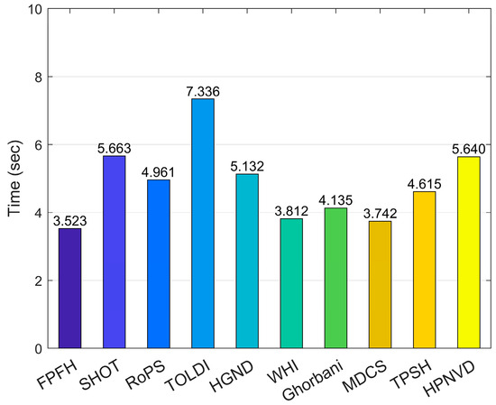 From Figure 15, it can be observed that the computation speed of HPNVD and HGND is almost the same. This is because they both compute the feature of normal vector projections in the neighborhood, and the calculation of normal vectors is the most time-consuming step in the entire descriptor computation process. Therefore, as the support radius increases, the computation time of HPNVD and HGND increases significantly. Compared to TOLDI, which also encodes projected grid height, WHI has higher computational efficiency, thanks to its single-view projection and the shared computation between LRF estimation and information encoding. Overall, RoPS and FPFH are the two most time-consuming features. RoPS mainly consumes more time because it calculates the scatter matrix on all points on the local surface, rather than just the triangle vertices. FPFH needs to compute the simplified point feature histograms for all neighboring points, and the time consumption increases significantly as the support radius increases. In comparison, WHI and SHOT have the lowest computation cost. Although the HPVDN proposed in this study has a relatively long computation time, its discrimination ability and robustness are the best, which is a balance between descriptiveness, robustness, and efficiency.