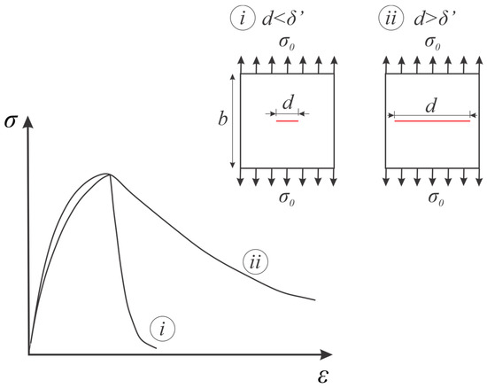 Based on the above concept, Figure 3 shows the behavior of a structure considering the presence of a given crack of size . If is smaller than the horizon, , case (i), then it is possible for the crack propagates unstable, and brittle behavior is expected. On the other hand, if the crack is larger than the horizon, case (ii), then this crack does not enter inside the horizon and ductile failure occurs.