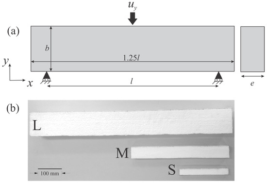 In order to analyze the size effect, unnotched beams with rectangular cross-sections are considered. The specimens were submitted to three-point bending testing, Figure 4a. Table 1 and Figure 4b show the average dimensions of the three sizes considered (with the depth of the beam, b, being the characteristic structural size), named in the following as Large (L), Medium (M), and Small (S). Tests were conducted under displacement-controlled mode up to final collapse, with the same strain rate maintained for all the sample sizes. The displacement rate is presented in Table 1 as well.