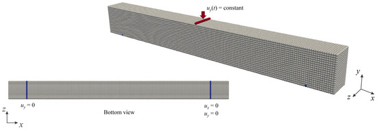 The beams described above were numerically simulated by employing 3D PD models. The models consist of a number of particles along the x, y, and z direction, respectively, equal to 40 × 5 × 3 for the S size, 80 × 10 × 6 for the M size, and 160 × 19 × 13 for the L size. For all the specimen sizes, is equal to 5 mm. Regarding the boundary conditions, see the example of the L size in Figure 5; the particles highlighted in blue on the left-hand side are constrained along the y direction, while those on the right-hand side are constrained along the x and y directions. On the particles located at the center of the beam, highlighted red in Figure 5, a uniform vertical displacement was applied in the y direction.