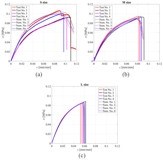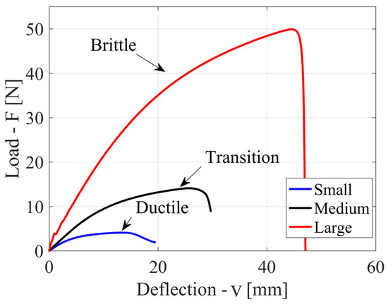 By assuming b equal to the depth of the beam (see Table 1) and equal to the average numerical flexural strength (see Table 3), the stress brittleness number, computed according to Equation (21), is equal to 1.68, 1.33, and 1.02 for S, M, and L size, respectively. Therefore, the behavior presented in Figure 6 and also that presented in Figure 5 for both experimental and numerical results are in agreement with respected to the predicted brittleness observed.