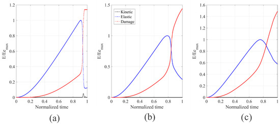 Kinetic, elastic, and damaged energies normalized with respect to the maximum elastic energy against the normalized time for: (a) L, (b) M, and (c) S sizes.