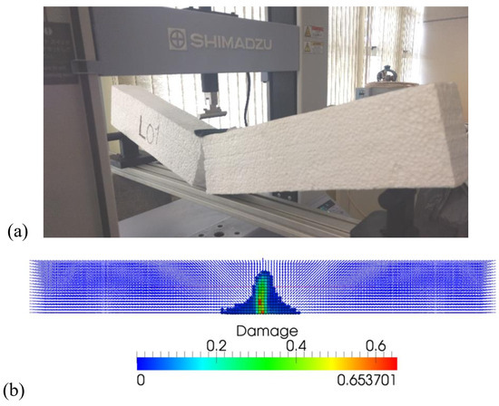 Moreover, a comparison of the experimental and numerical results reveals that the numerical results are valid up to the maximum flexural load, as evidenced by the greater softening observed in the experimental results, which is not reflected in the numerical data. This suggests that additional damage mechanisms may be at play, which the PD model is unable to fully capture.