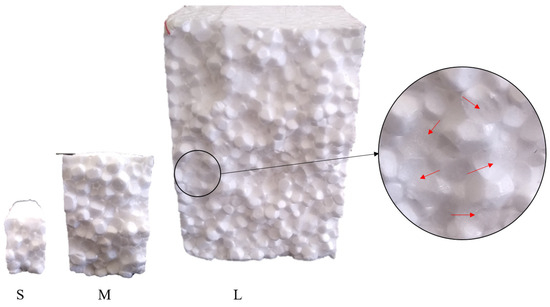 The mechanical and physical properties of the EPS constituting the beams are the following: mass density = 11.9 kg/m3 [46], elastic modulus = 3.12 MPa [46], fracture energy = 233.96 N/m [61], and flexural strength = 0.1 MPa. In order to characterize the material at the microstructural scale, a statistical analysis was performed in [61] to compute the average grain size of the EPS, obtaining its value equal to 5.02 mm.