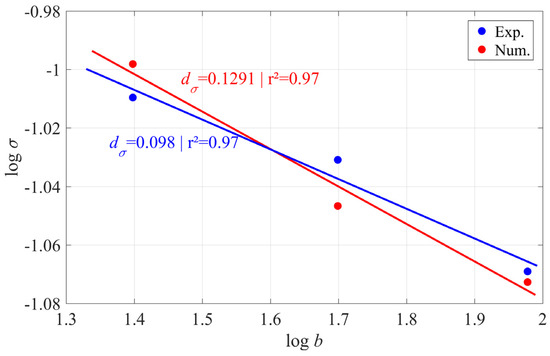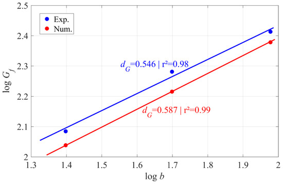 Regarding the size effect analysis, the sum of the fractal exponents shows an error, calculated with respect to the theoretical one, equal to −1.20% and −2.10% for the experimental and numerical results, respectively. Moreover, the ductile-to-brittle transition behavior is observed in both experimental and numerical results, a clear signature of the size effect in quasi-brittle materials.