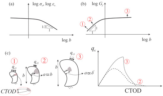 - For the fracture energy, when , the size dependence is maximum, that is, directly proportional to the structural size, whereas when , no scale effect is observed.