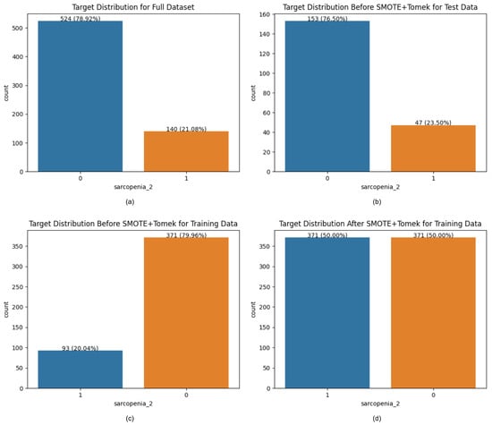 In this study, SMOTE+Tomek was selected to mitigate the class imbalance within the sarcopenia dataset. In particular, this approach addresses the disparity in the representation of sarcopenia-positive cases. By generating minority class samples, SMOTE guarantees that the predictive model encounters an adequate number of sarcopenia instances. At the same time, Tomek links enhance class boundaries by eliminating near-boundary instances that create uncertainty. This hybrid technique enhances class separation and reduces overfitting, leading to more accurate boundary definition between classes and improving the model’s sensitivity to sarcopenia cases. Consequently, SMOTE+Tomek contributes to a more balanced dataset that optimizes recall, precision, and generalization, aligning with the study’s goal of reliable sarcopenia prediction [22]. This resulted in a balanced dataset for training, as visualized in the post-resampling target distribution (Figure 1).