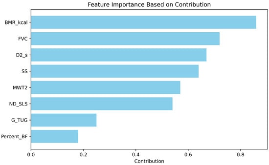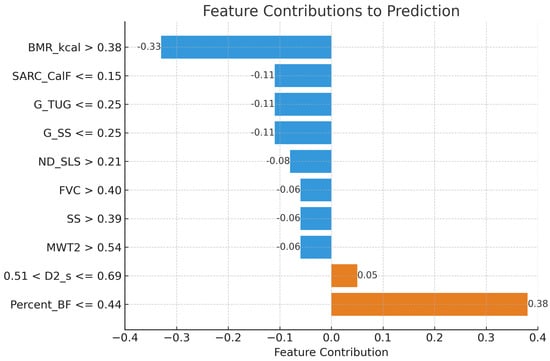 LIME was chosen in this study because of its ability to improve model interpretability, a critical factor for clinical applications of machine learning in the prediction of sarcopenia. By providing local explanations, LIME facilitates insight into the contribution of individual features, such as basal metabolic rate (BMR) and body fat percentage, to each specific prediction, thereby aligning with personalized healthcare approaches [36]. The model-agnostic nature of LIME allows it to be applied flexibly to the CatBoost algorithm without requiring access to its internal structure, supporting the study’s focus on accuracy and interpretability. This feature is particularly valuable for identifying influential predictors within a complex, multifactorial condition like sarcopenia, enabling clinicians to understand better and trust the model’s decisions. Furthermore, LIME’s local interpretability assists in refining feature selection and optimizing the model by highlighting the most impactful variables, which enhances both computational efficiency and predictive accuracy. By increasing transparency in decision-making, LIME also helps meet ethical and regulatory standards for explainable AI, making it a suitable choice for healthcare applications that prioritize clarity, fairness, and reliability [37].
