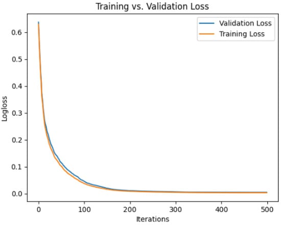 - Iterations: the number of boosting iterations was set to 500, ensuring adequate training cycles without excessive computation time.