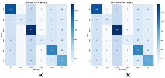 Transformers [13] were developed for natural-language-processing-related tasks and have shown promising results in various domains, including computer vision. A self-attention mechanism can determine the significance of various segments of the input image, which means that transformers can effectively learn global contextual information. This point is crucial for medical images, as disease patterns may be diffuse and relatively indistinct. Unlike CNNs, which are used to perform convolutions through kernels, transformers can model dependencies directly. M. Odusami et al. [14] demonstrated that vision transformers could classify stages of AD with high accuracy when there were three classes. Similarly, P. He et al. [15] utilized a transformer model that extracted spatiotemporal features from the rs-fMRI dataset for binary classification, which improved the classification accuracy. Castro-Silva [16] adopted a 3D vision transformer model for multimodal data that was a mixture of MRI, demographics, and cognitive assessments, using three datasets for a two-stage classification of AD. Overall, the high accuracy demonstrates that transformers are helpful for capturing patterns related to the disease’s various stages.