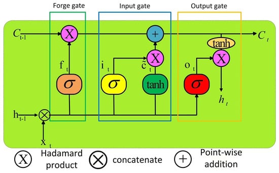 Long Short-Term Memory (proposed by Hochreiter S. and Schmidhuber J. in 1997) [30] neural networks represent a revolutionary breakthrough in time-series modeling, fundamentally advancing traditional Recurrent Neural Networks (RNNs). The architecture’s effectiveness stems from its three-gate system and dual-channel information flow: input, forget, and output gates work synergistically as dynamic information filters. Through the coordinated use of sigmoid and tanh activation functions, this system achieves exponential growth in model capacity while only increasing parameters by one-third. Unlike traditional RNNs that rely on a single hidden state for memory storage, LSTM introduces an innovative dual-state architecture. The cell state maintains long-term memory via linear interactions that create a “gradient highway”, while the hidden state focuses on short-term feature extraction. This separation facilitates the effective addressing of long-term dependency issues. And the architecture’s multi-scale modeling capability simultaneously captures minute-level fluctuations and quarterly trends. In stock price prediction, for instance, the forget gate preserves long-term financial report impacts, while the input gate integrates real-time trading volume changes, with the output gate dynamically adjusting prediction granularity. These innovations have substantially improved prediction accuracy, making LSTM the preferred architecture for modeling sequences exceeding 500 time steps. Furthermore, it established theoretical foundations for subsequent models like GRU and attention mechanisms, ushering in a new era of intelligent gating systems for temporal modeling. Based on the research by Gers, Felix A, and Schmidhuber et al. (2000), we have drawn the architecture diagram of the LSTM model, as detailed in Figure 1 [31].