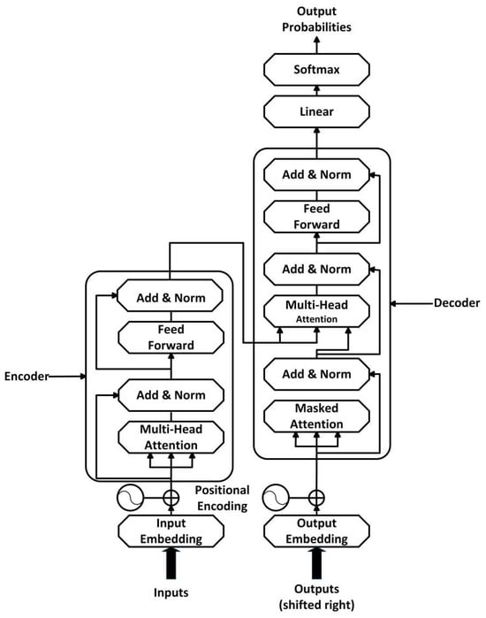 The Transformer is an innovative deep learning framework that processes sequential data using attention mechanisms rather than recurrence. Its encoder–decoder structure enables parallel computation, thereby overcoming the limitations of traditional sequential processing. The encoder stacks multiple identical layers, each containing a multi-head self-attention sublayer and a feed-forward neural network. Residual connections and layer normalization help stabilize training. The decoder integrates self-attention with encoder–decoder attention to generate context-aware outputs. Positional encoding embeds sequence order information into input representations, enabling the model to capture long-range dependencies. Multi-head self-attention extracts diverse feature representations from distinct subspaces, balancing computational efficiency with robust pattern recognition. The architecture is illustrated in Figure 2.