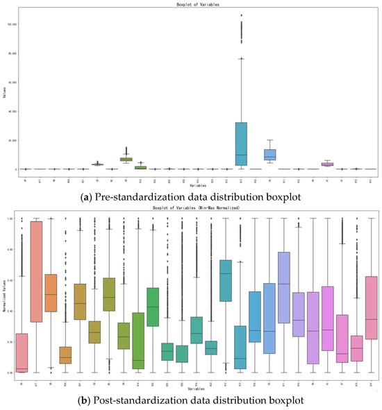 Figure 4 illustrates the multidimensional optimization effects of Min–Max normalization on the LSTM–Transformer hybrid model through a comparative analysis of pre- and post-normalization data distributions. Key insights include the following: