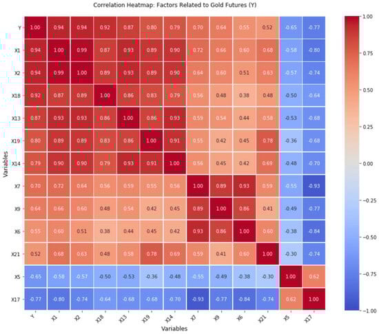 An initial correlation analysis of 25 candidate variables revealed distinct relationships between gold futures prices (Y) and multi-dimensional market indicators. Strong positive correlations (e.g., S&P 500 Index: ρ > 0.90; NASDAQ Index: ρ > 0.90; silver futures: ρ > 0.90) suggest complementary behavior between gold and risk assets during market volatility. In contrast, negative correlations (e.g., 1-year Chinese government bond yield: ρ = −0.65; USD-denominated real estate ETF: ρ = −0.77) highlight the suppressive effects of rising interest rates and competing investment alternatives on gold prices. For details, please refer to Figure 5.