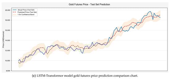 As shown in Table 3, the LSTM–Transformer hybrid model demonstrates superior performance in gold futures price prediction. Compared with baseline models, it reduces MAE by 47.4% (421.01 vs. 800.18 USD/ounce against LSTM) and 59.6% (vs. Transformer’s 1042.89 USD/ounce), with RMSE improvements of 46.7% (528.26 vs. 992.41 USD/ounce) and 59.6% (vs. 1307.17 USD/ounce), respectively. These metrics confirm enhanced error control and robustness against extreme values. And the model’s R2 score of 0.9618 significantly outperforms both LSTM (0.8430) and Transformer (0.7763), indicating stronger explanatory power through the combined temporal modeling of LSTM and the global pattern analysis of Transformer.