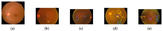 Diabetes is a chronic disease characterized by insufficient insulin secretion from the pancreas or a decrease in the body’s sensitivity to insulin, resulting in an increase in blood sugar levels [1,2,3]. According to the statistics of the China Diabetes Market Report: 2024–2032, China is presently the nation with the greatest number of diabetics globally, and the prevalence of diabetes has risen to about 12%. Long-term complications of diabetes can result in serious vision problems, with DR serving as the primary cause of blindness among individuals aged 20–64 [4]. DR is a severe eye complication resulting from diabetes, characterized by thinning of the retinal blood vessel wall, hemorrhage, fluid exudation, macular edema, and abnormal angiogenesis. These pathological changes may eventually lead to vision loss or even blindness [5]. The pathologic features of DR include microaneurysms (MAs), hard exudates (EXs), soft exudates (SEs), and hemorrhages (HEs) [6]. Based on the International Clinical Diabetic Retinopathy Scale (ICDRS), the types of DR are classified as normal, mild nonproliferative, moderately nonproliferative, severe nonproliferative, and proliferative. These five types of DR are illustrated in Figure 1 below.