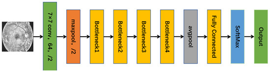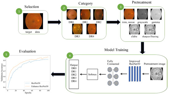 The main purpose of this paper is to use the deep learning model Resnet50 presented in [26] for early diagnosis of DR and to enhance the accuracy of diagnosis by modifying the network structure and the optimizer. However, due to the problems of noise, uneven illumination, and insufficient contrast in original medical images, the learning effect of the model and the diagnostic accuracy will be degraded. In addition, DR datasets, especially DR samples with early-stage lesions (e.g., mild non-value-added DR), are often limited in number, which leads to model overfitting, poor generalization ability, and poor performance in the face of unseen images. Therefore, it is necessary to perform image preprocessing and image augmentation on the original image. The system flow diagram of the DR classification system is demonstrated in Figure 2.