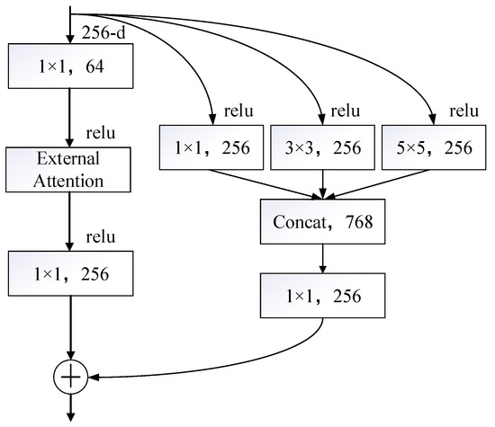 where Concat represents a feature stitching operation, and the convolution operations , , and represent 1 × 1, 3 × 3, and 5 × 5 convolutions applied to the input x. It adds features from different convolution kernels (or different layers) along the channel dimension to form a feature map with more channels. The main purpose of 1 × 1 convolution is to regulate the number of channels so as to guarantee that the stitched feature map is in line with the feature map of the main path regarding the number of channels. This allows for a smooth residual connection.