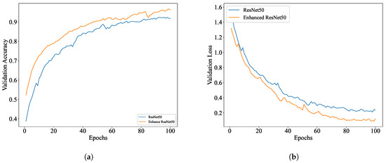 According to the experimental results in Table 7, compared with the ResNet50 benchmark model, the validation accuracy of the enhanced ResNet50 is increased by 4.36% under the condition that the training efficiency is slightly reduced (the total training time is 146.97 min, an increase of 16.35%). The results show that the proposed enhancement module can extract data features more effectively while maintaining reasonable training efficiency so as to improve the validation accuracy without excessive loss of speed.