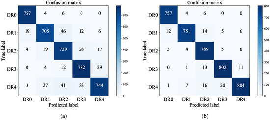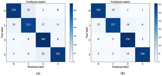 To rigorously assess the generalization ability of the proposed model, we carried out supplementary experiments on the Messidor dataset. The dataset contains 1200 fundus images, divided into four grades (0, 1, 2, 3) by clinical severity. In this study, the sample size was expanded to 14,400 images using the same image preprocessing and image augmentation methods as before. All samples are partitioned into a training set, a validation set, and a test set in the ratio of 7:2:1 to guarantee a balanced distribution of each category, adjusting the final fully connected layer to output four classes. Then, the network needs to be retrained because a different number of classes (from 5 to 4) results in a different distribution of outputs. The model parameter settings are the same as in Section 3.2. The evaluation indicators of the test before and after model enhancement are shown in Table 10, and the results of the confusion matrix are shown in Figure 12 below.