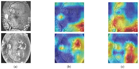 In Grad-CAM-based visualization analysis, the heat map uses three colors—blue, yellow, and red—to characterize the model’s attention to different regions of the input image. Specifically, the red area indicates the parts that the model is highly concerned about and have made significant contributions to decision-making. The yellow area has the second highest degree of attention, which has a certain auxiliary effect on decision-making. The blue area has a smaller contribution and is often considered redundant information. By comparing the Grad-CAM heat maps shown in Figure 13b,c, we observe that the enhanced model, Figure 13c, demonstrates significantly broader and more detailed attention to the lesion areas. Specifically, the area that originally belonged to blue (low concern) was transformed into a yellow or even red (high concern) region in the enhanced model, and the original yellow lesion area was further transformed into a red lesion area, indicating that the attention of the model to this region was significantly improved. This change shows that the enhanced ResNet50 model can more effectively identify and focus on the lesion area, thereby improving the detection accuracy of DR.