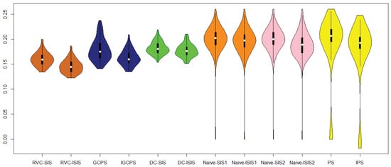 In Example 2, the model is nonlinear. Each component of the multivariate response has the same nonlinear function of the active predictors. The only difference is the corresponding coefficients. It is easy to check, in this example, that the components of the response are strongly correlated. Note that the smaller the rank of a predictor, the easier it is to be selected. Thus, we can conclude from Table 1 that our proposed method RVC-SIS and RVC-ISIS outperforms the remaining ones in terms of the rank of the important predictors. Naive-SIS1, Naive-SIS2, and PS perform badly in selecting the important predictors –. Naive-ISIS1 and Naive-ISIS2 still fail to detect –, while IPS still exhibits bad performances in choosing due to the large rank. The rank of active variables – in GCPS is too high to be chosen, while the rank of in IGCPS is low enough to be selected. Although DC-SIS behaves badly in selecting in this context, DC-ISIS dramatically improves its performance. From Table 2, we can see that DC-ISIS, RVC-SIS, and RVC-ISIS can pick up – with an overwhelming probability. Naive-SIS1, Naive-SIS2, and PS select these predictors with little chance. Naive-ISIS1 and Naive-ISIS2 still fail to detect –, while IPS cannot identify . GCPS selects with overwhelming probability, while IGCPS chooses – with a large probability. Table 3 demonstrates that only DC-ISIS, RVC-SIS, and RVC-ISIS include all important predictors – with a low M, indicating that the four predictors have a higher priority of being selected by these screening methods and thus are ranked at the top.