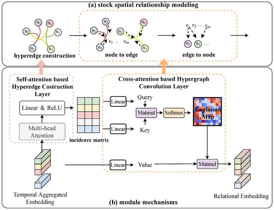 - Hybrid Attention Hypergraph Module: This module is designed to explore the spatial relationships between stocks. It comprises two attention layers: the self-attention-based hyperedge construction layer dynamically generates hyperedges, while the cross-attention-based hypergraph convolution layer performs hypergraph convolution on stock nodes based on the generated hyperedge matrix.