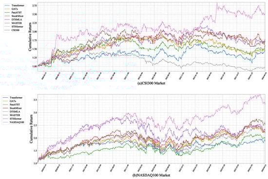 Figure 3 presents the cumulative returns of all methods under identical trading conditions. STHformer demonstrated superior financial performance for both the Chinese and American markets, generating significantly higher terminal wealth. This outperformance across distinct markets confirms the model’s enhanced stock selection capability.