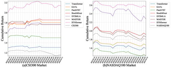 To test the model’s stability under different conditions, we selected the backtest results during the Russia–Ukraine war period for analysis. Figure 4 presents the cumulative return for all models during the Russia–Ukraine war period. The event period, marked by fluctuating market conditions, presented a challenging environment for the models. The different models exhibited varying levels of adaptability to the market volatility induced by the war. STHformer showed a stronger cumulative return, while the others demonstrated more moderate responses. It is worth noting that, on the CSI300 dataset, most models executed a stop-loss strategy due to the decline reaching the stop-loss threshold, while STHformer had a smaller decline, staying below the threshold, and thus actually carry out trades.