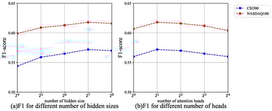 - Number of hidden sizes: Figure 5a shows the comparison of F1 scores for the STHformer model with different hidden layer sizes. The experimental results indicate that the model achieved the best predictive performance when the hidden layer size was set to . It is worth noting that as the hidden layer size was increased further, the predictive performance of STHformer tended to stabilize. Based on this analysis, this chapter adopted as the optimal hidden layer configuration for the model.