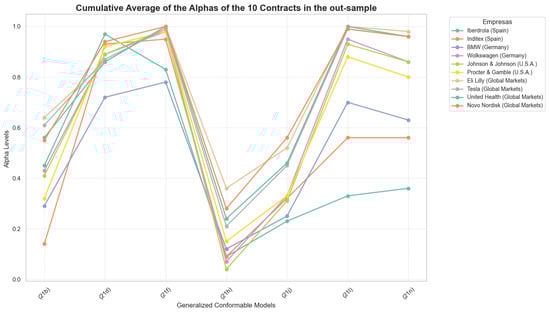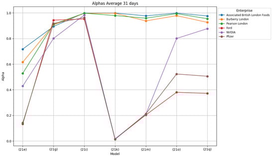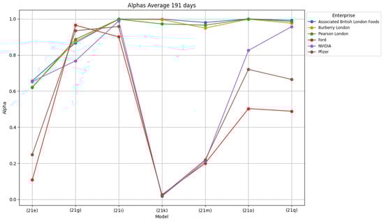 On the abscissa axis are the names of the general conformable models, and on the ordinate axis is the value of the alphas. In the box inside the graph are the names of the each firm.