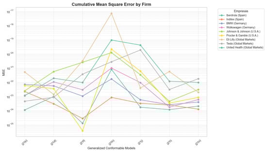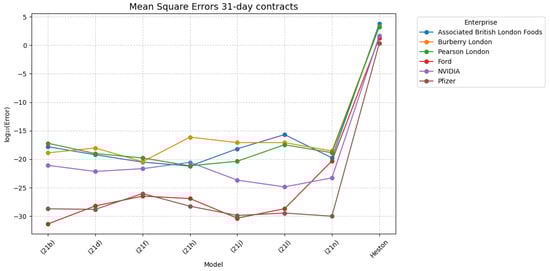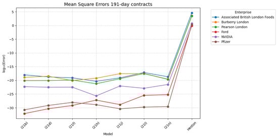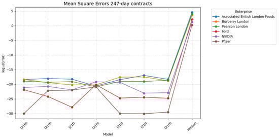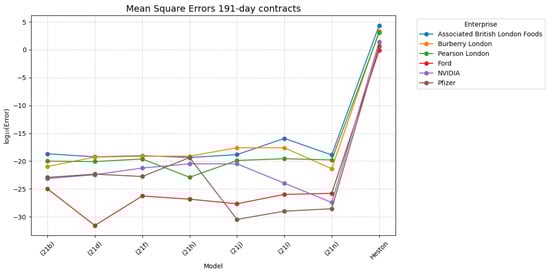 To facilitate the reader’s comparison of the MSEs, it is important to note that these calculations are presented in Figure 4, Figure 5, Figure 6 and Figure 7, as the base 10 logarithm was applied to the MSEs because it was difficult to show the performance of each model for each company due to the very small amount.