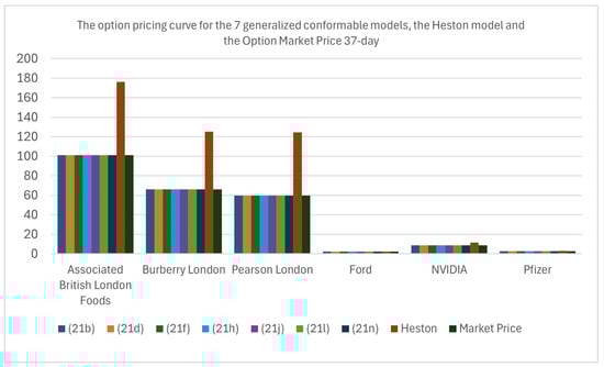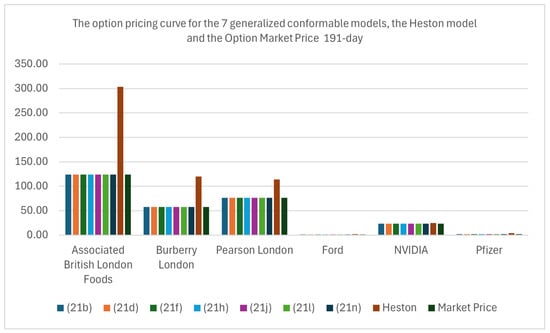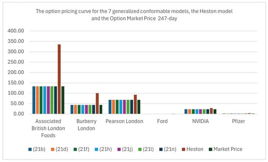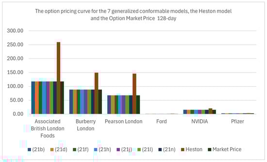We also decided to verify the positivity and stability of the results of the seven generalized conforming models, as well as the traditional Heston model. To do this, we took a sample of European call contracts from six international companies: Associated British London Foods, Burberry London, Pearson London, Ford, NVIDIA, and Pfizer, taking into account that for the analysis we used their five strike prices and their expiration dates of 7, 128, 191, and 247 days. We plotted the option values obtained from the eight models. We also plotted the market value of the contract price. In order to maintain the parsimony of the empirical analysis, we plotted only one of the strike prices for each of the maturities. With all values in the first quadrant of the Cartesian plane, the results of the graphs confirmed positivity and stability. The excellent fit of the seven generalized conformal models was also verified.