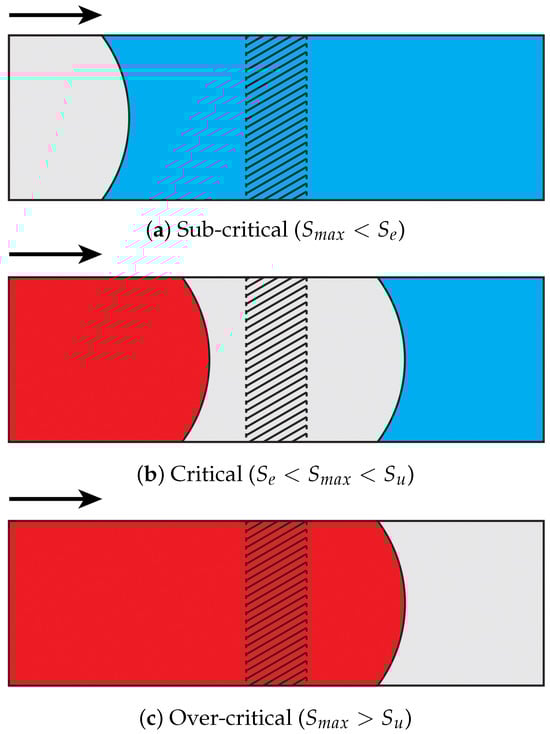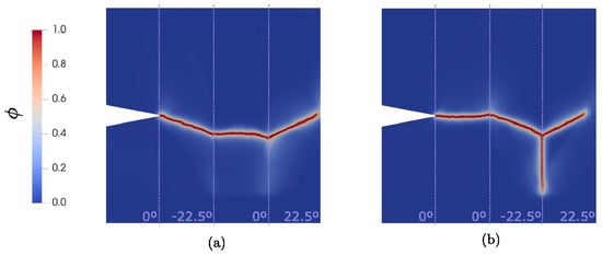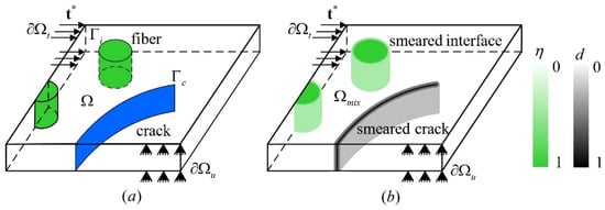 One alternative method to CDM is the phase-field model (PFM) [,,,,]. PFM, rooted in a variational approach to fracture mechanics, represents a specific form of smeared or diffusive gradient damage modeling taking into account energy minimization principles. The approach considers cracks in a diffused manner without the explicit representation of discontinuities [,]. The method facilitates the incorporation of cracks within the simulation without ad hoc procedures for determining the crack path []. Single or multiple scalar parameters are defined in the medium to account for the transition between intact and completely damaged regions, as depicted in Figure 1. With this method, crack-tracking algorithms will no longer be required [].