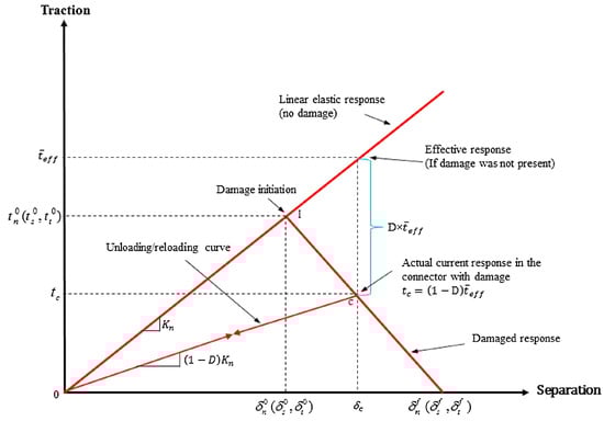 The cohesive zone model (CZM) is a widely used explicit meso-scale approach for simulating intra-layer damage through a cohesive formulation which captures the nonlinear interfacial softening behavior through a traction–separation law (TSL), as depicted in Figure 3, and mitigates issues with high-stress gradients at the delamination front []. CZMs effectively handle the nonlinear zone ahead of the crack tip, accommodating phenomena like plasticity and micro-cracking without requiring refined mesh configurations []. Initially developed to model energy dissipation rates [], CZMs are capable of simulating damage initiation, propagation, and interactions, such as delamination coupled with matrix cracking []. By modeling the fracture process as a transition from an intact material to a completely broken one, CZMs operate independently of the bulk material’s mechanical behavior [] and are easily implemented in conventional finite element codes []. They provide a simplified and effective means to define crack growth paths by applying the traction–separation law to cohesive elements along the crack path.
