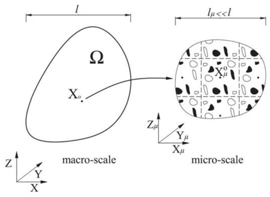 With the advancement of computational power, multiscale homogenization methods have emerged as a viable approach for analyzing composite materials. These methods compute the stress–strain response at each macroscopic integration point by solving an RVE or unit cell, which is modeled as an independent subproblem. To ensure the validity of this approach, a clear scale separation between the macrostructure and microstructure must be maintained (see Figure 4), as well as its periodicity [].