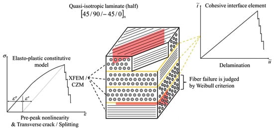 Given the diverse range of damage mechanisms in composite materials and their profound influence on overall structural integrity, the implementation of progressive damage analysis (PDA) is essential. PDA provides a systematic framework for simulating the initiation, evolution, and interaction of damage within the composite medium. Typically, two distinct regions—intra-layer damage and delamination damage—are identified and formulated independently []. Intra-layer damage involves phenomena such as matrix cracking, fiber breakage, and fiber–matrix debonding, while delamination refers to inter-layer separation. However, advanced studies have explored the coupling of these regions to achieve a more accurate representation of composite behavior under various loading conditions [,,,,].