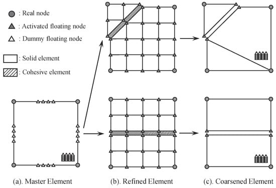 - Lu, X.; Chen, B.Y.; Tan, V.B.; Tay, T.E. Adaptive floating node method for modelling cohesive fracture of composite materials. Eng. Fract. Mech. 2018, 194, 240–261. [Google Scholar] [CrossRef]