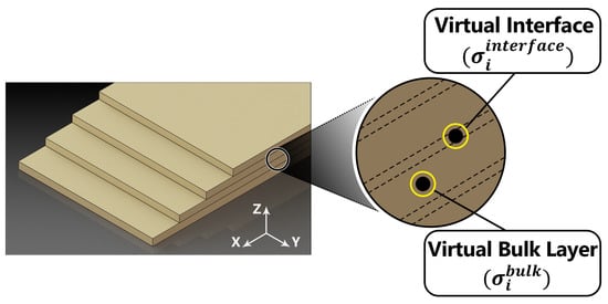 Three-dimensional solid finite element models offer the highest level of detail by explicitly representing the full geometry and anisotropic behavior of each ply, including inter-ply interfaces. These models can capture complex stress states, including out-of-plane stresses that are critical for predicting delamination []. However, they are computationally expensive, particularly for large structures or when fine meshes are needed to resolve local effects like matrix cracks or fiber–matrix debonding []. Moreover, modeling the entire laminate stack-up with full 3D elements can lead to ill-conditioned problems due to the extreme aspect ratios between in-plane and thickness dimensions [].